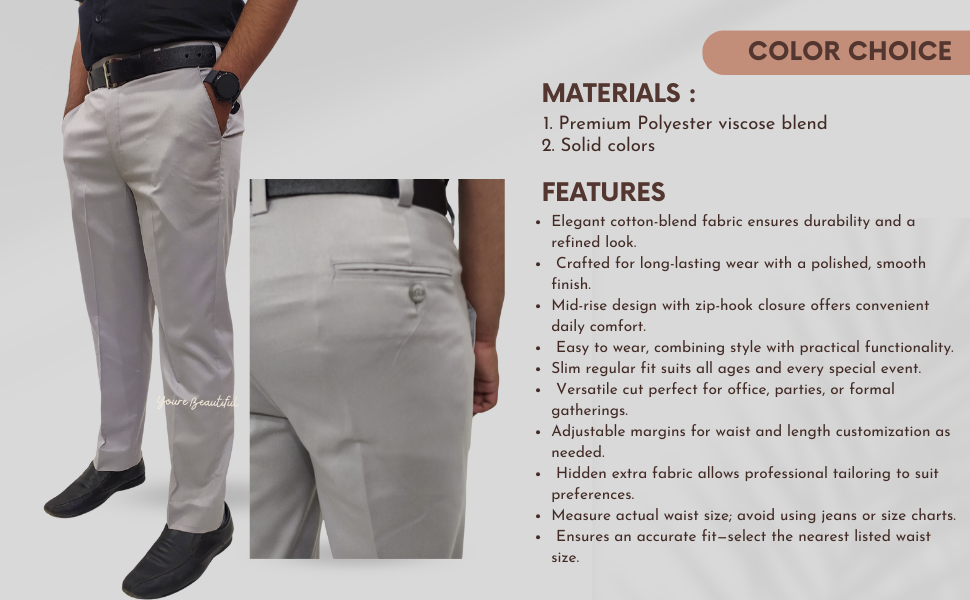 - Formal flat front cross pant made of mix cotton blend fabric for a perfect finish with 4 pockets and hem stitch bottom